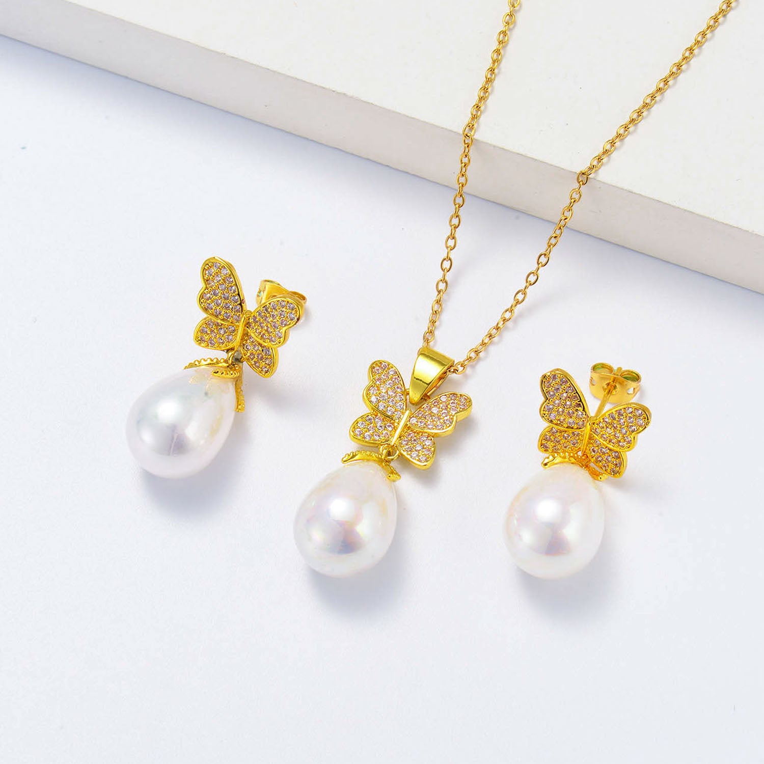 gold plated butterfly with pearl earrings necklace jewelry set
